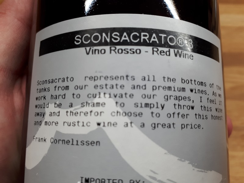 Sconsacrato jest jednak inne, ponieważ jak pisałem wyżej, jest zestawieniem resztek z produkcji wszystkich win producenta. Składa się z Nerello Mascalese (80-90%), Alicante Boushet, Minelli Nera, Uva Francesca, Sangiovese, Minelli Bianco i Insolii. Przy ogromie pracy wkładanej przy uprawie i produkcji win, Cornelissenowi żal jest wylewać te "cuda natury". W efekcie wino jest mętne, ale wielopłaszczyznowe. Niesie sobą esencjonalny ładunek oraz obraz wulkanicznego terroir. W nosie początkowo nieco kiszonkowe, ale po chwili uwydatniła się czerwona śliwka (z kompotu), malina i żużel. Usta wytrawne, z kwasowością dzikiej, fermentującej wiśni. Jest też wczesna czerwona porzeczka, jabłko, ale również zielone orzechy, kawa, zioła i liść tytoniu. Wino prezentuje oryginalny styl, który da się lubić, ale można go również nie akceptować. Degustującym może nie odpowiadać kiszonka, dzika kwasowość i mętność w kieliszku, ale z drugiej strony da się tą nieoczywistość pokochać. Z pewnością Sconsacrato jest winem dla osób poszukujących win nietypowych, dla osób znudzonych odmianowymi winami o przewidywalnych aromatach i smakach. Ps. Kupujcie świadomie ;)